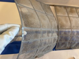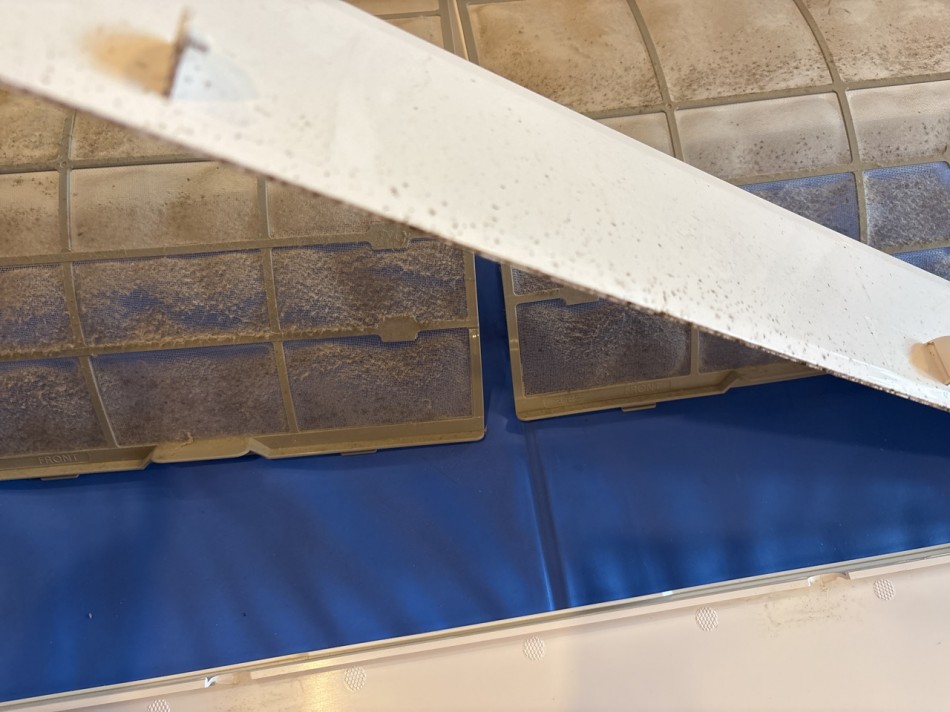 埼玉県三郷市のおそうじ本舗三郷南店です。富士通製 AS-C22J-W 2019年製エアコンクリーニングのご紹介です。約6年後使用のエアコンです。ではビフォーアフターをご覧ください。